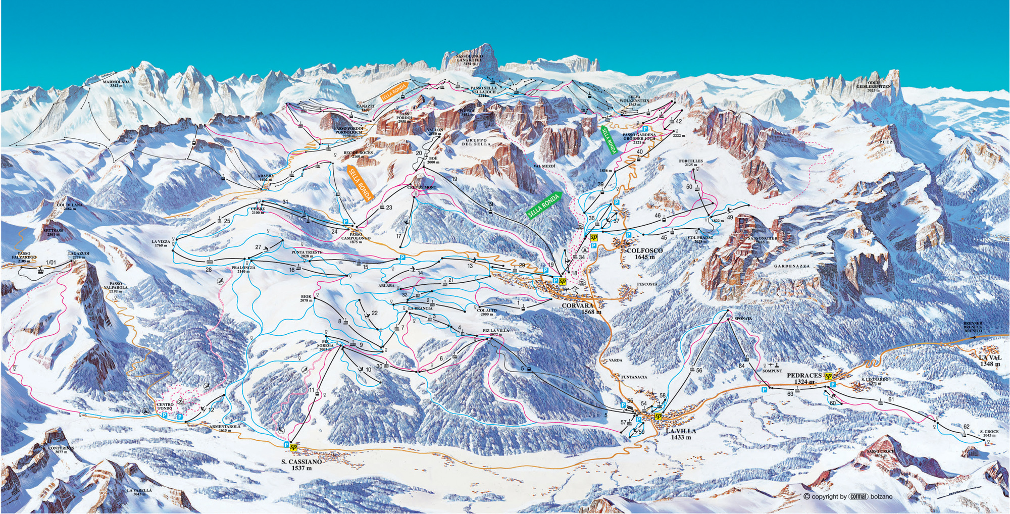 Alta Badia je súčasťou okruhu Sella Ronda spolu s ďalšími 3 vyhlásenými lyžiarskymi strediskami: Arabba / Marmolada, Val Gardena / Alpe di Siusi a Val di Fassa e Carezza. Tieto strediská sú prepojené v dĺžke 410 km zjazdovými traťami rôznej obtiažnosti a tiež lanovkami. Tí, ktorí vlastnia skipas Dolomity Superski, môžu využiť lyžovanie aj v dostupných zimných rezortoch Kronplatz / Plan de Corones a prestížnej Cortiny d'Ampezzo.