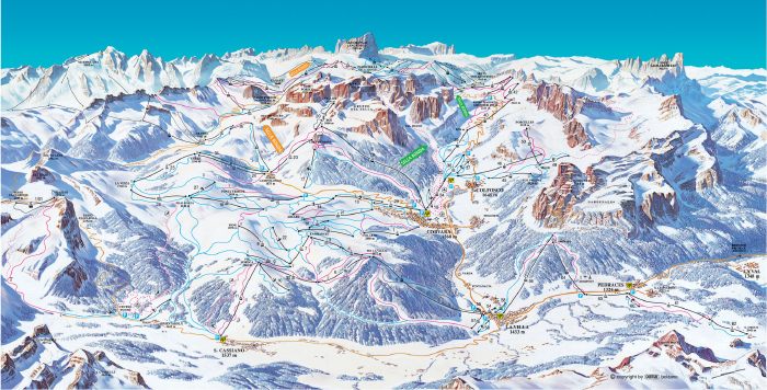 Potešenie z lyžovania umocňuje všadeprítomná krása majestátnych hôr, ktorých štíty, zvyčajne pozlátené slnkom, dodajú vášmu pobytu v srdci hôr tú správnu atmosféru. Nekorunovanou kráľovnou celej oblasti je aj najvyššia hora Dolomitov, mohutná Marmolada, týčiaca sa do 3342 mnm.