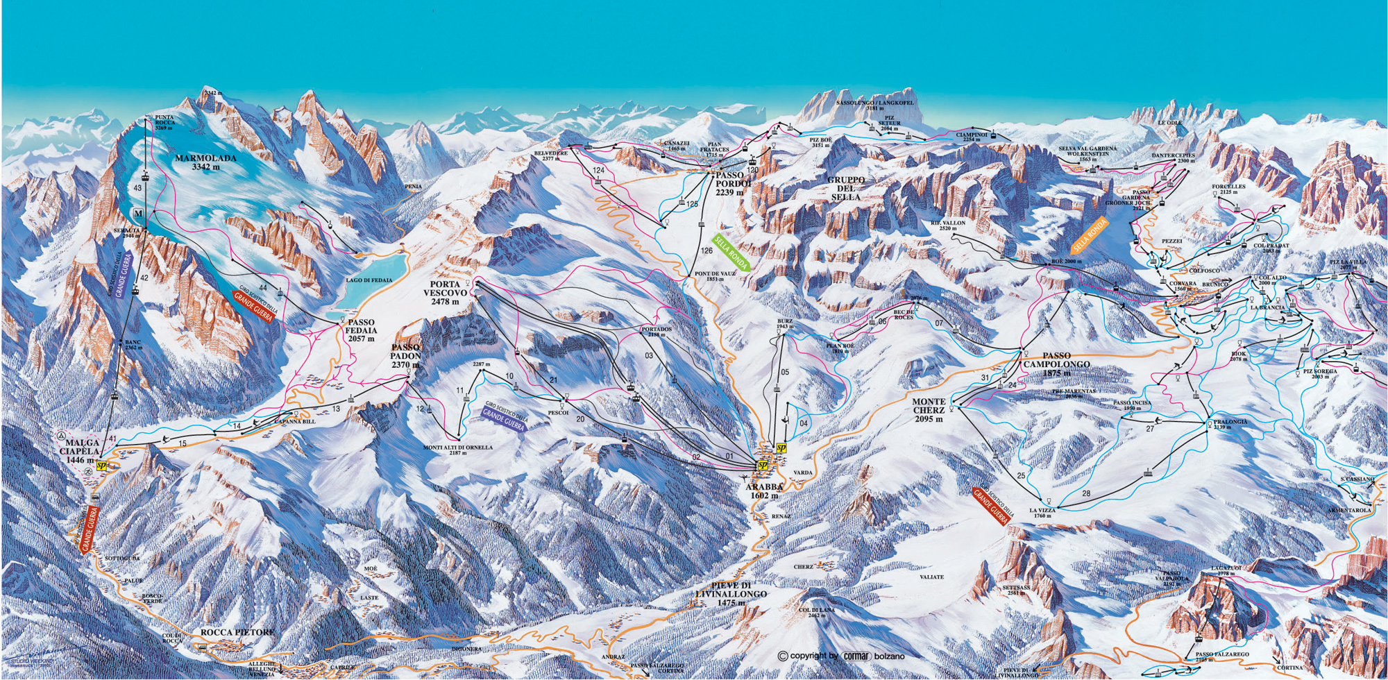 Dominantou celej oblasti je hora Marmolada 3342 m, ktorá je najvyššou horou celých Dolomitov. Ľadovec hory Marmolada je orientovaný na sever a teda celá oblasť ponúka možnosti lyžovania aj v jarnom období. Z vrcholu Marmolady si možno vychutnať 12 km dlhú červenú zjazdovú trať Pista Bellunese, ktorej cieľ je v mestečku Malga Ciapela. Späť sa dostanete novo zrekonštruovanou kabínovou lanovkou. Arabba a Malga Ciapela dýchajú atmosférou rozprávkovo krásnych horských dediniek, ktoré ešte nie sú stále dotknuté masovou turistikou.