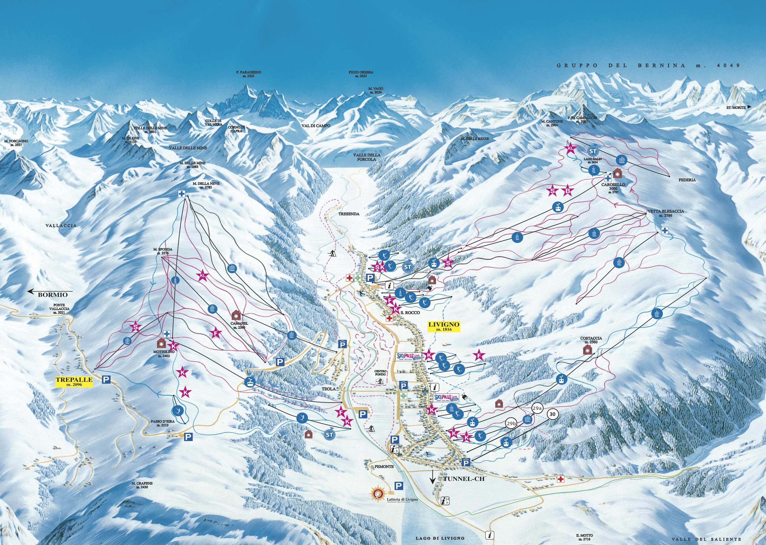 Ponuka lyžovania v podobe 115 km zjazdových tratí: prevažná časť zjazdoviek (75 km) sa nachádza na západnej strane Carosello, zvyšné väčšinou čierne trate (40 km) sú na východnej strane Mottolino, kde sa sieť zjazdových trás každoročne ďalej rozrastá.