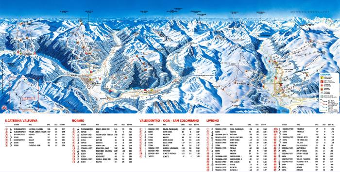 V oblasti môžete lyžovať na 225 kilometroch v rámci jedného skipasu v skiareáloch Livigno, Bormio, Valdidentro/Oga/San Colombano a Santa Caterina. Všetky tieto areály sú svojimi kvalitnými, prepojenými a náročnými zjazdovými traťami plne porovnateľné so známymi francúzskymi strediskami. Nech je to napr. Bormio s 10 kilometrovou zjazdovou traťou a prevýšením 1780 m, kde nájdete ako ideálne podmienky na lyžovanie, tak i termálne kúpele, či oblasť S. Caterina s náročnou zjazdovkou Bucaneve, alebo Livigno so svojimi 115 kilometrami zjazdových tratí.