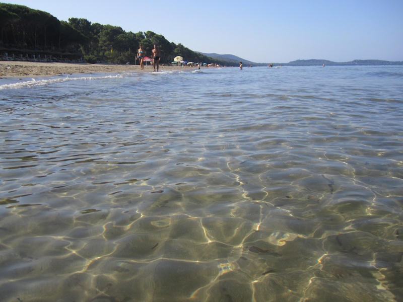 70 m (platená s plážovým servisom), piesok je jemný, zlatistej farby. Pláž je piesočnatá s pozvoľným vstupom do vody, vhodná pre deti (sú tu detské atrakcie ako hojdačky, trampolíny, preliezačky). Na pláži sú na prenájom lodičky, vodné bicykle, plachetnice alebo surfy.