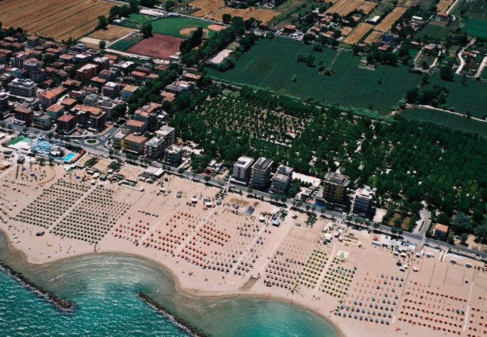 Pre pobrežie Rimini je typická veľmi široká a dlhá pláž so zlatistým jemným pieskom a priľahlou promenádou. Pláž je vhodná pre rodiny s malými deťmi, pretože má pozvoľný vstup do vody. Village leží cca 50 m od pláže, plážový servis v cene (slnečník + 2 kresielka / izba). Vodné športy na pláži za poplatok.