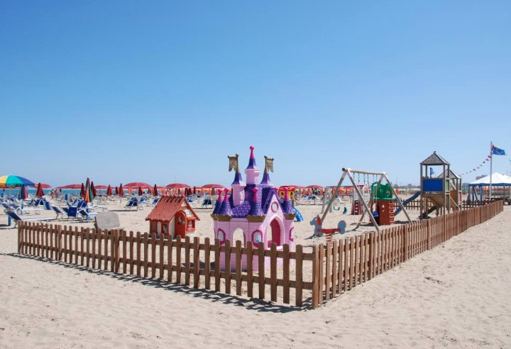 Pre pobrežie Rimini je typická veľmi široká a dlhá pláž so zlatistým jemným pieskom a priľahlou promenádou. Pláž je vhodná pre rodiny s malými deťmi, pretože má pozvoľný vstup do vody. Village leží cca 50 m od pláže, plážový servis v cene (slnečník + 2 kresielka / izba). Vodné športy na pláži za poplatok.