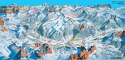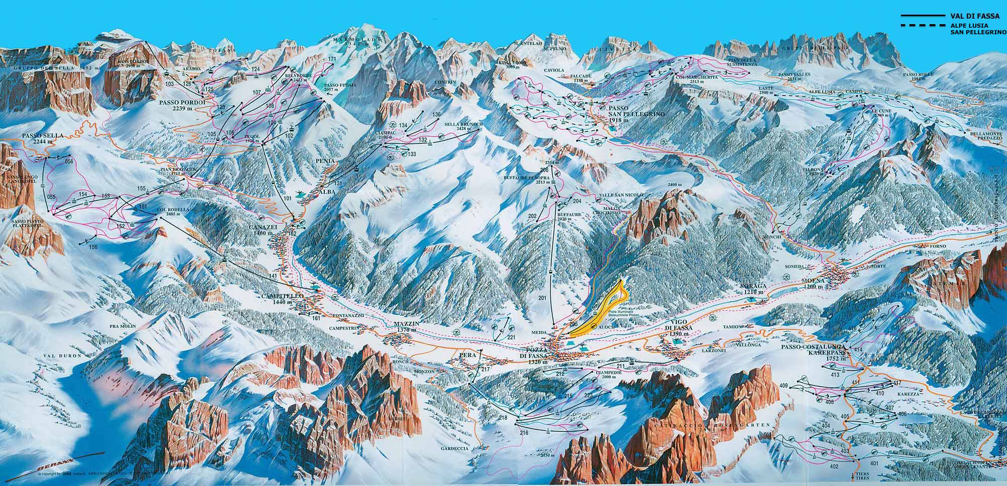Údolie Val di Fassa s veľmi pestrou ponukou lyžovania leží medzi Južným Tirolskom a Trentinom. Na severe nájdete skupinu Sella s priesmykmi Passo Sella a Passo Pordoi, odkiaľ sa dostanete lanovkou na vrchol Sas Pordoi a odtiaľ môžete obdivovať okolité vrcholky hôr.