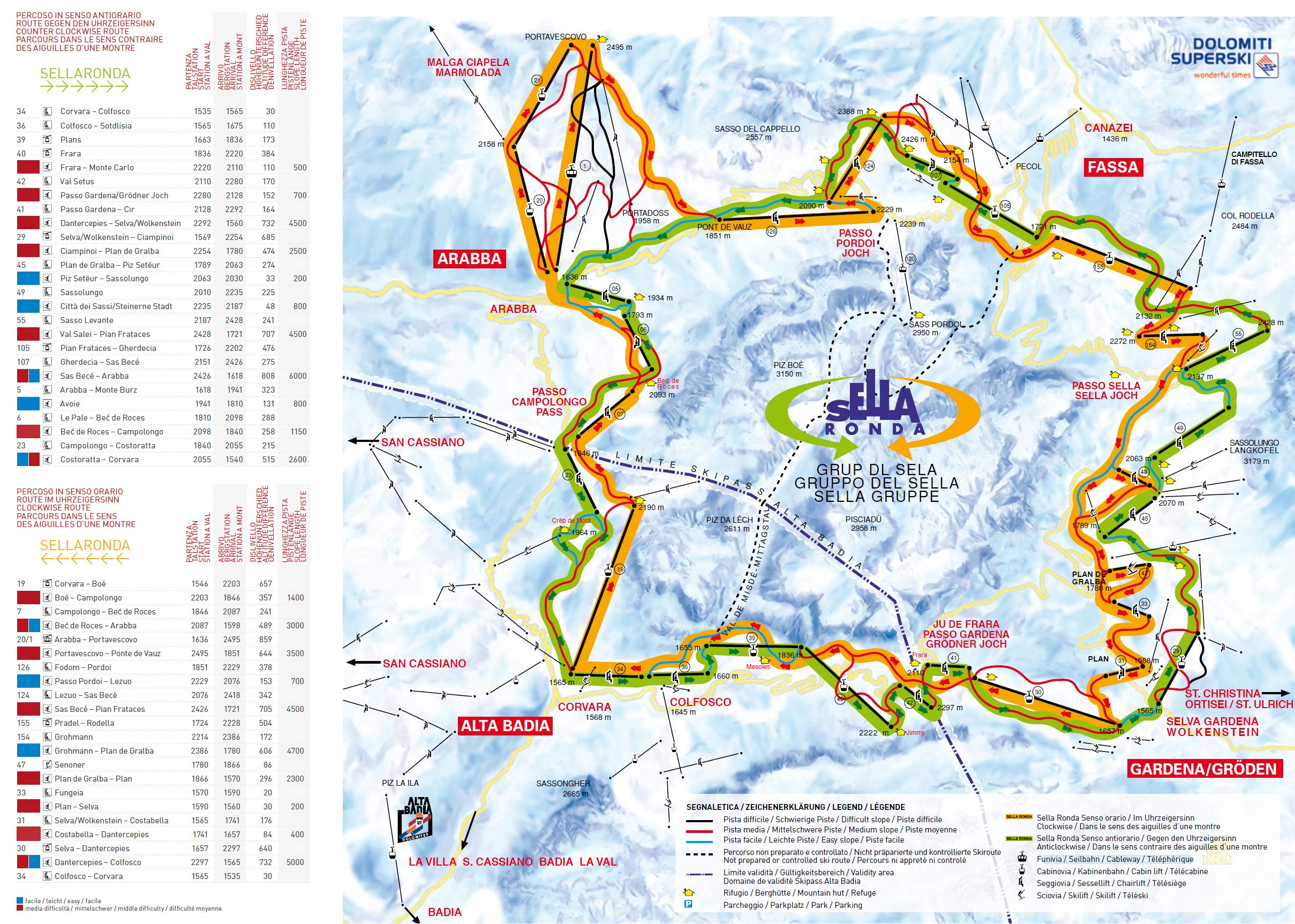 Do okruhu Sella Ronda patria štyri vyhlásené lyžiarske strediská: Arabba / MARMOLADA , ALTA BADIA , VAL DI FASSA - Carezza a VAL GARDENA. Strediská sú lyžiarsky prepojené v dĺžke 410 km zjazdovými traťami rôznej obtiažnosti a tiež lanovkami.